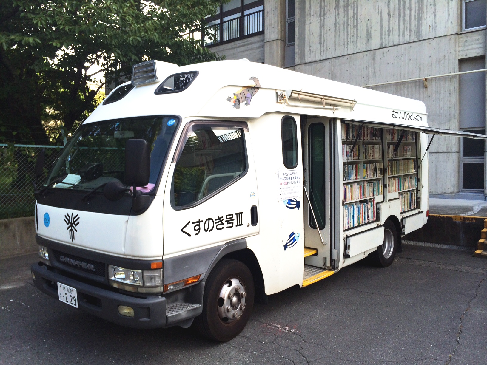 図書館から遠いところ26箇所へ、2週間に一度、移動図書館くすのき号が行きます。約3000冊の本を乗せています。