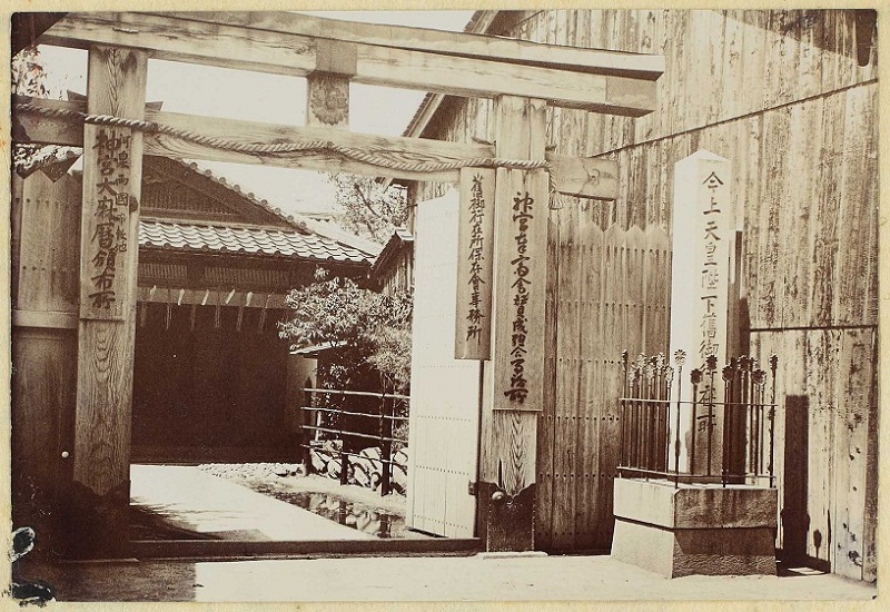 明治10年(1877)、明治天皇の行幸があり、中之町にあった豪商の河盛仁平邸宅が行在所(あんざいしょ)となった。この行在所を記念し永久存続の為、明治20年神宮堺教会所とし、明治22年に神宮奉斎会と改称、大麻暦頒布所(たいまれきはんぷしょ)となった。のちに、明治天皇行在所跡として鈴鹿氏が所有し保存されていたが、居住者転居により昭和8年(1933)堺市教育会が保存した。現在は私有地で、阪堺線脇に立つ石碑が唯一の面影となっている。