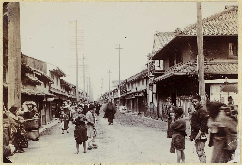 『写真集堺』でこの写真は「花田口角より見た大道筋(だいどうすじ)」とされる。戎之町と櫛屋町の間を通る長尾街道と大道の交差点が花田口である。大道は阪堺線敷設と空襲に備えた建物疎開、戦災後の区画整理で西側に広げられた。写真の道は阪堺線東側と思われる。大道筋は紀州街道の一部で、綾之町から北は元の道幅でその面影が残る。右手前の民家に似た住宅が桜之町に現存する。